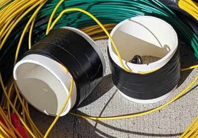 Loading coils were added to shorten the 80m legs to about 45' long each. An 80m dipole in an NVIS configuration would normally be around 115' to 120' long. My goal with this antenna was to keep the footprint to less than 100' diameter. I used this online calculator to determine what specific microhenry value would be needed for the coils based on coil location, wire size, former diameter, and the center frequency. The calculator also gave me different options for location of the coils, and different former sizes I decided to place the coils in the middle of the legs. I also used a coil inductance calculator downloadable from the site to determine how many turns of wire on the former was needed to reach the required uH value. With that info in hand, and knowing the uH value I needed, I attached the 80m wire (yellow wire) at the hub, marked the wire 22.5; from the hub, drilled a small hole in one end of the former, and began winding the coils. I only needed to adjust the number of turns by about 1/2 to reach the desired uH value, as determined by my LC meter. I then drilled another hole in the former and pulled the rest of the wire through.
