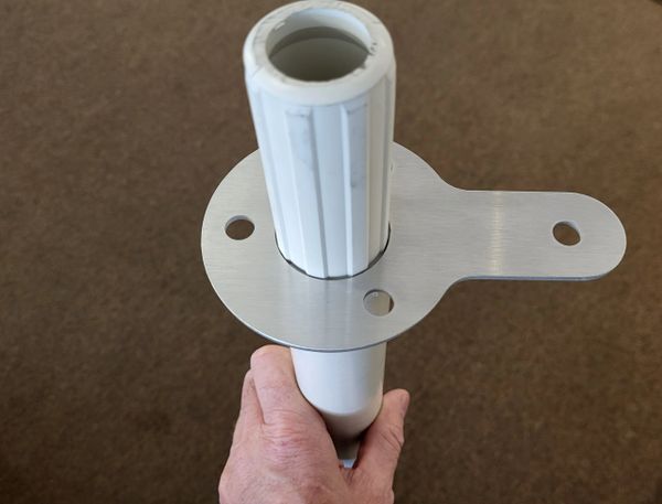 I designed these guying rings to be multipurpose. They fit over one end of the mast, then once another section is slid on it firmly traps the guying ring. The ring is designed to allow the mast to be tied off in 3 directions. The tab allows you to add a carabiner and pulley to hoist up an additional wire antenna, or to mount something like a 2m/70cm vertical antenna. Waterjet cut from 1/8" thick 6061 aluminum.