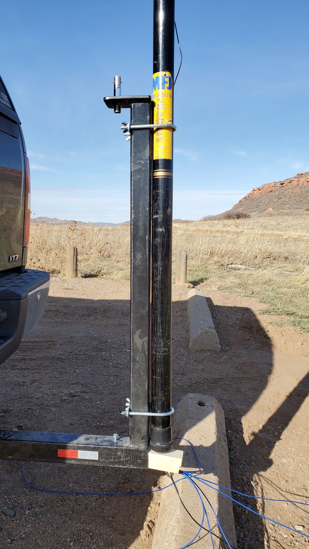 The hitch mount also works perfectly to erect one of my mast poles. I picked up the 2" u-bolts from my local Ace Hardware. Since they only need to be snugged up and not super tight, I added wing nuts to the u-bolts so they can be hand tightened. The small piece of wood sticking out of the hitch mount, and below the mast, is to keep the mast from sliding down. During this activation I was using