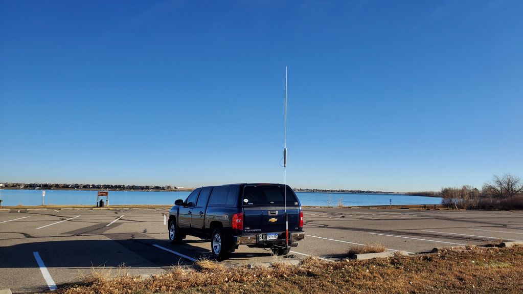 This is the most common configuration in which I use the hitch mount. I run a 3' extension under the coil to center load it, then I will run either a 78" or 102" whip on the coil. I'll use the 102" whip when I want to use 60m. Shown here is my larger BNC V.1 coil which, along with the 102" whip and added radials, will tune down to the FT8 frequency of 80m.