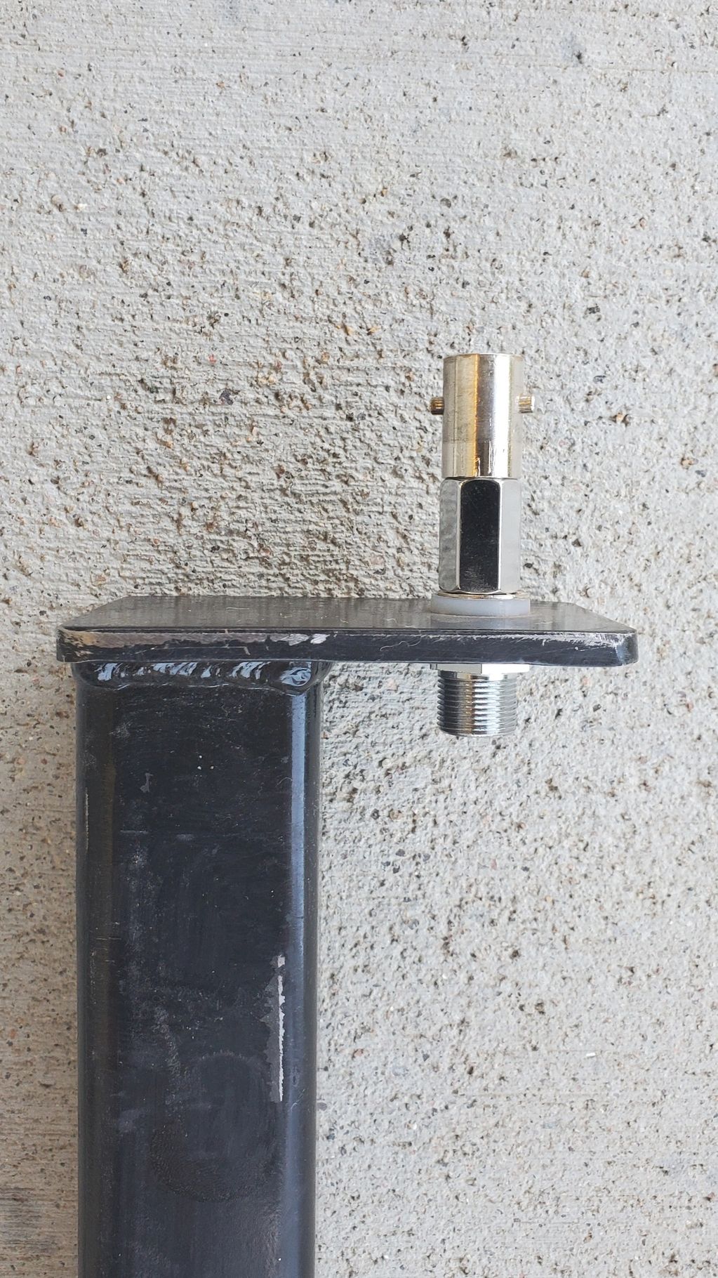 The tab welded to the top of the upper arm is a piece of 1/4" tick flat bar. Installed in that is an SO-239 to 3/8"-24 bulkhead fitting. This is the common adapter used on CB antenna mirror mounts, and they are readily available from Amazon and just about any place that sells ham or CB radios.